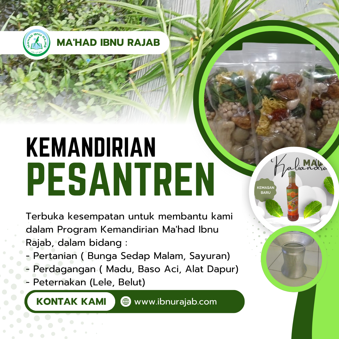 Kami selalu berusaha untuk menjadi Mahad yang mandiri, bidang yang sedang kami lakukan : - Pertanian (Bunga Sedap Malam, Sayuran) - Perdagangan ( Baso Aci, Madu, Peralatan Dapur) - Peternakan (Lele, Belut, Ayam)